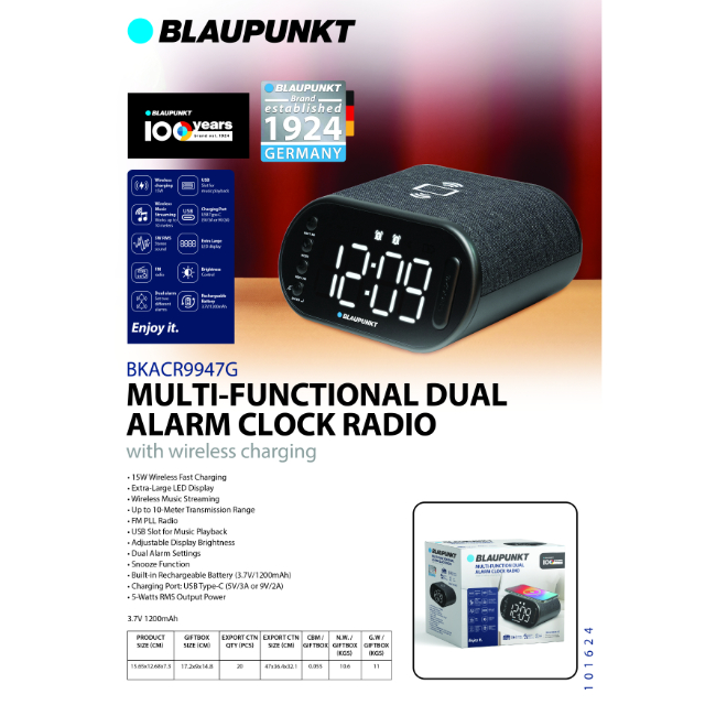 BLAUPUNKT 15W DUAL ALARM CLOCK WIRELESS CHARGER (BKACR9947G)