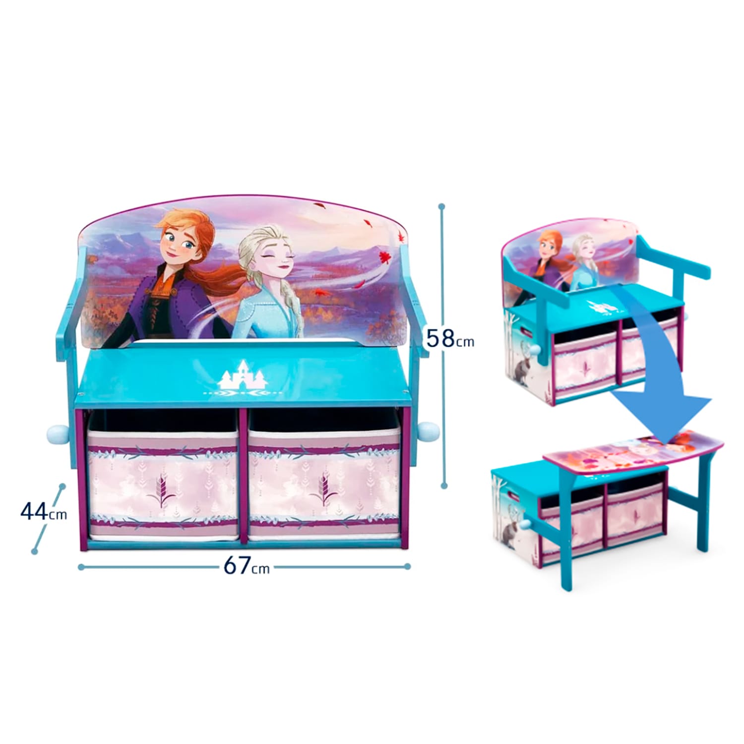 The snowy scenes and icy filigree depicted on the Disney Frozen II Convertible Activity Bench will give you chills! Adorned with colorful graphics of Anna, Elsa, Olaf and Sven, it’s the perfect place for any Frozen fan to sit or play. An ideal choice for your growing child, it features a 3-in-1 design that easily converts from a storage bench to a desk—transitioning from playtime, to a perfect space for homework, crafts and more, in seconds! This incredibly versatile bench/desk also features ample storage underneath with two fabric bins, offering a perfect spot for kids to keep their toys, books or art supplies. A smart and stylish addition to your little one’s space, this sturdy activity bench will be cherished for years to come.